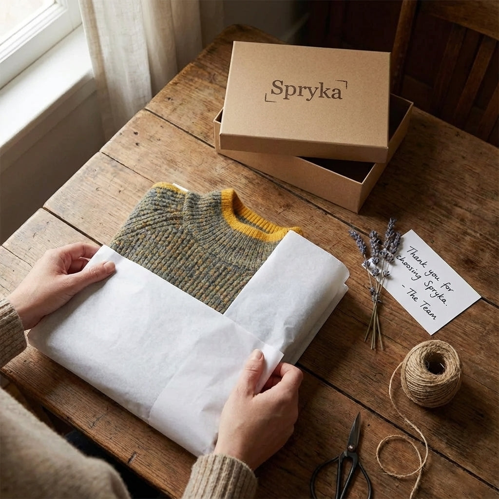 When you open a Spryka package, you're holding hours of work, years of experience, and a whole lot of love from a small team who still gets excited every time we ship an order. This isn't just a sweater or a coat — it's a piece of us, made for you.